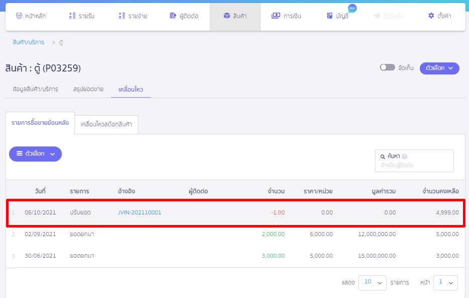 ขั้นตอนที่ 1 เลือกสินค้า >> สินค้า/บริการ >> ดูภาพรวม >> เลือกรหัสสินค้าที่ต้องการ Void การปรับยอดสินค้า