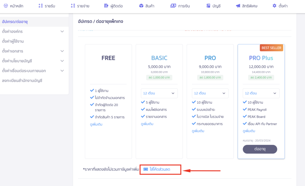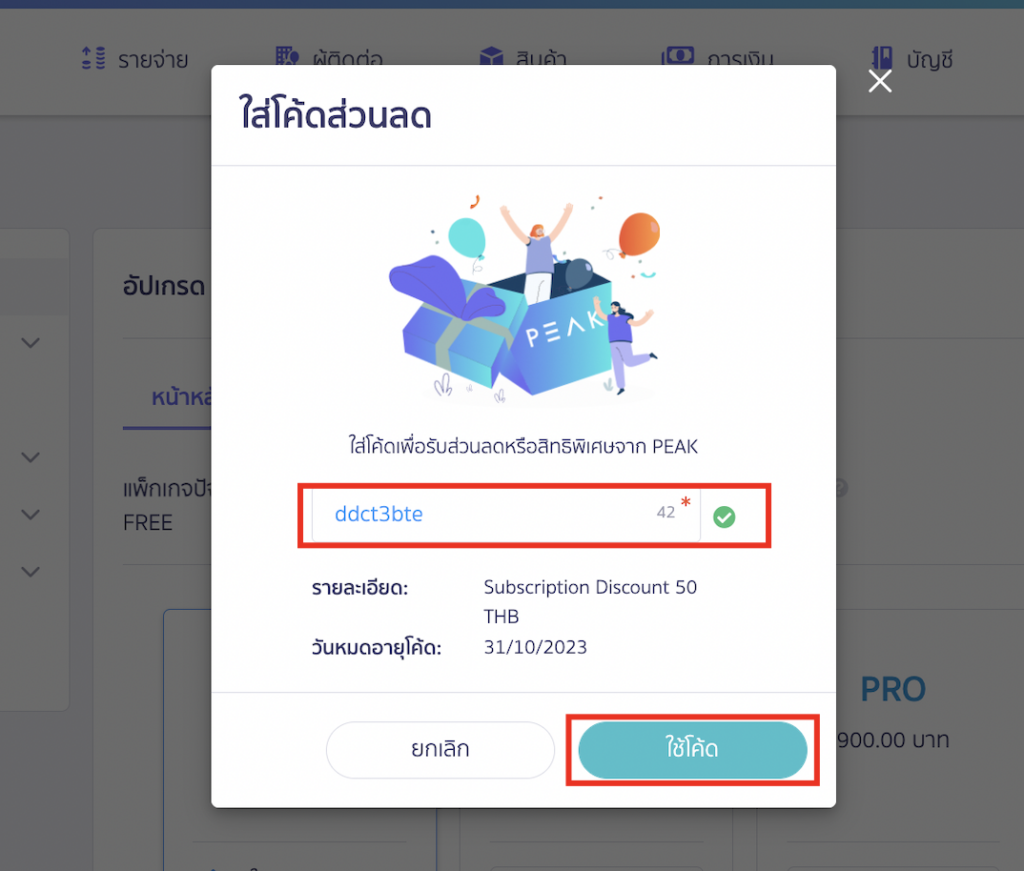 จากนั้นกดที่ปุ่ม ใช้โค้ด ระบบจะดำเนินการปรับส่วนลด/โปรโมชัน/แพ็กเกจ ตามโค้ดดังกล่าว
