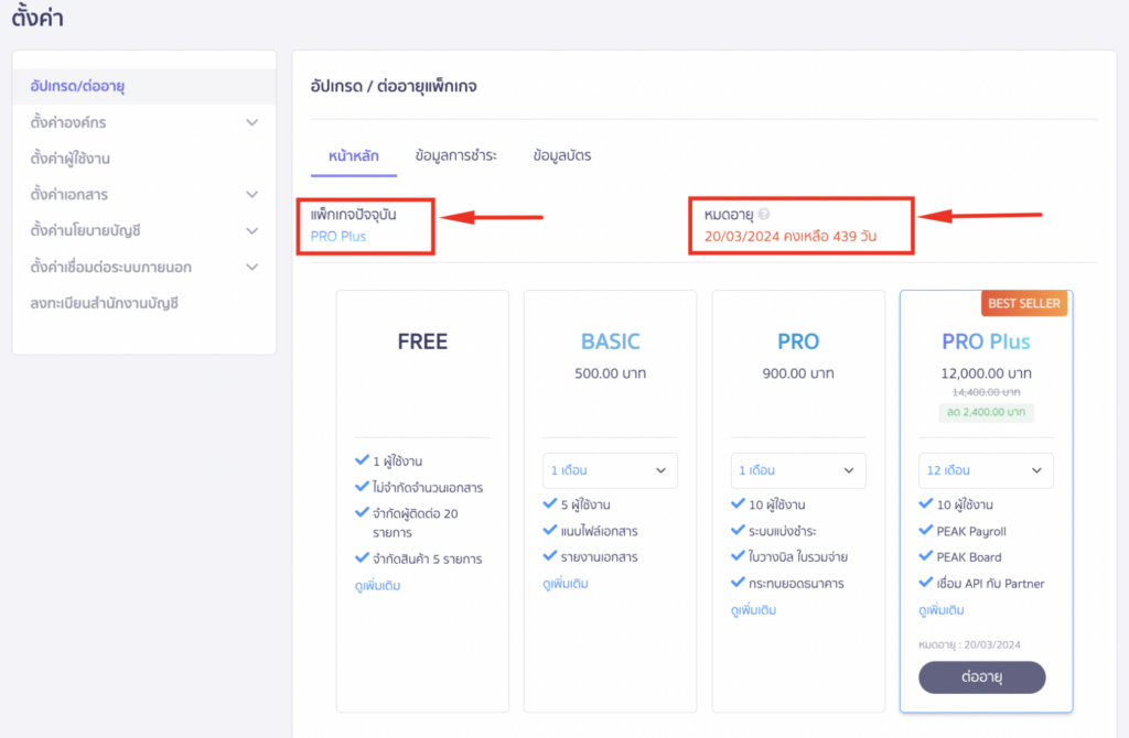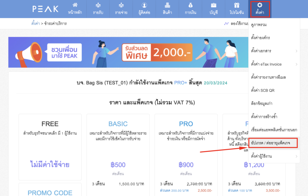 1. เข้าไปในหน้าตั้งค่า > อัพเกรด/ต่ออายุPackage