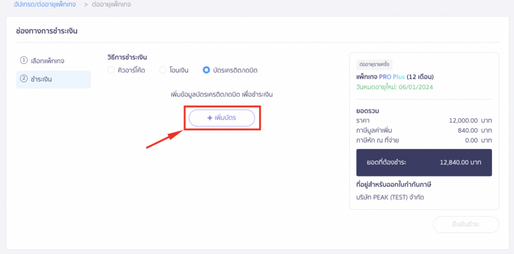 สามารถกดปุ่ม ‘+เพิ่มบัตร’ เพื่อเพิ่มข้อมูลบัตรเครดิต/เดบิต