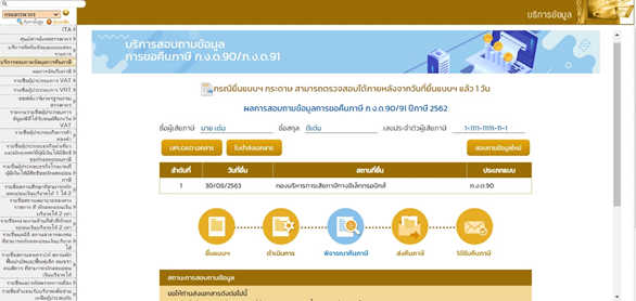 4. เมื่อเข้าสู่หน้าจอ “ผลการสอบถามข้อมูลการขอคืนภาษีภ.ง.ด.90/91” คุณสามารถตรวจสอบสถานะเงินคืนภาษีได้ กรณีที่กรมสรรพากรขอเอกสารเพิ่มเติมจะแสดงรายละเอียดในสถานะการสอบถามข้อมูล รวมถึงกำหนดเวลาและช่องทางการส่งเอกสาร