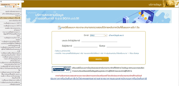 1. เข้าเว็บไซต์กรมสรรพากร เลือก บริการข้อมูล/ข้อมูลสำหรับผู้เสียภาษีเงินได้บุคคลธรรมดา/บริการสอบถามข้อมูลการคืนภาษี